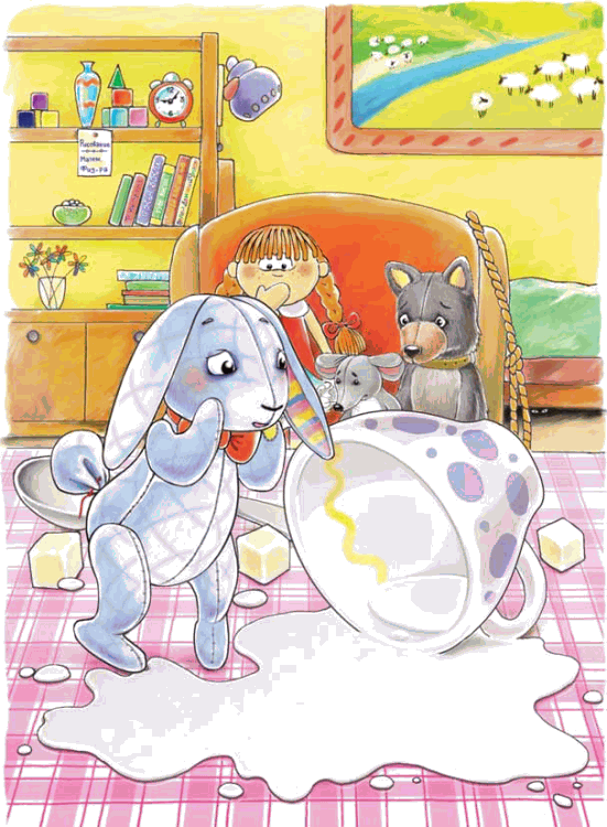 Зайчишка, конечно, тоже получился озорным. То вскарабкается на полку и уронит фарфоровую статуэтку, то усядется с хозяйкой завтракать, да опрокинет чашку с молоком… Катина мама очень сердилась, и даже пригрозила спрятать его в темную кладовку.