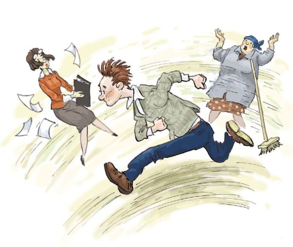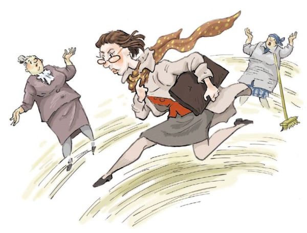 «Проспала!» – в ужасе вскрикнула Елена Николаевна и, подскочив с кровати, начала судорожно запихивать в сумку злополучные тетради. Наскоро умывшись и причесавшись, учительница накинула пальто и вылетела за дверь. Так быстро она никогда ещё в своей жизни не бегала. Разве что от контролёров в электричке. До школы Елена Николаевна долетела за пять минут. Переступив порог, она поздоровалась с тётей Машей и, не снижая скорости, побежала по коридору. Вдруг на пути ей попалась завуч по воспитательной работе Римма Петровна. Её невыспавшаяся, взволнованная учительница литературы просто не заметила. Последовало столкновение, от которого Римма Петровна живо закружилась вокруг своей оси.