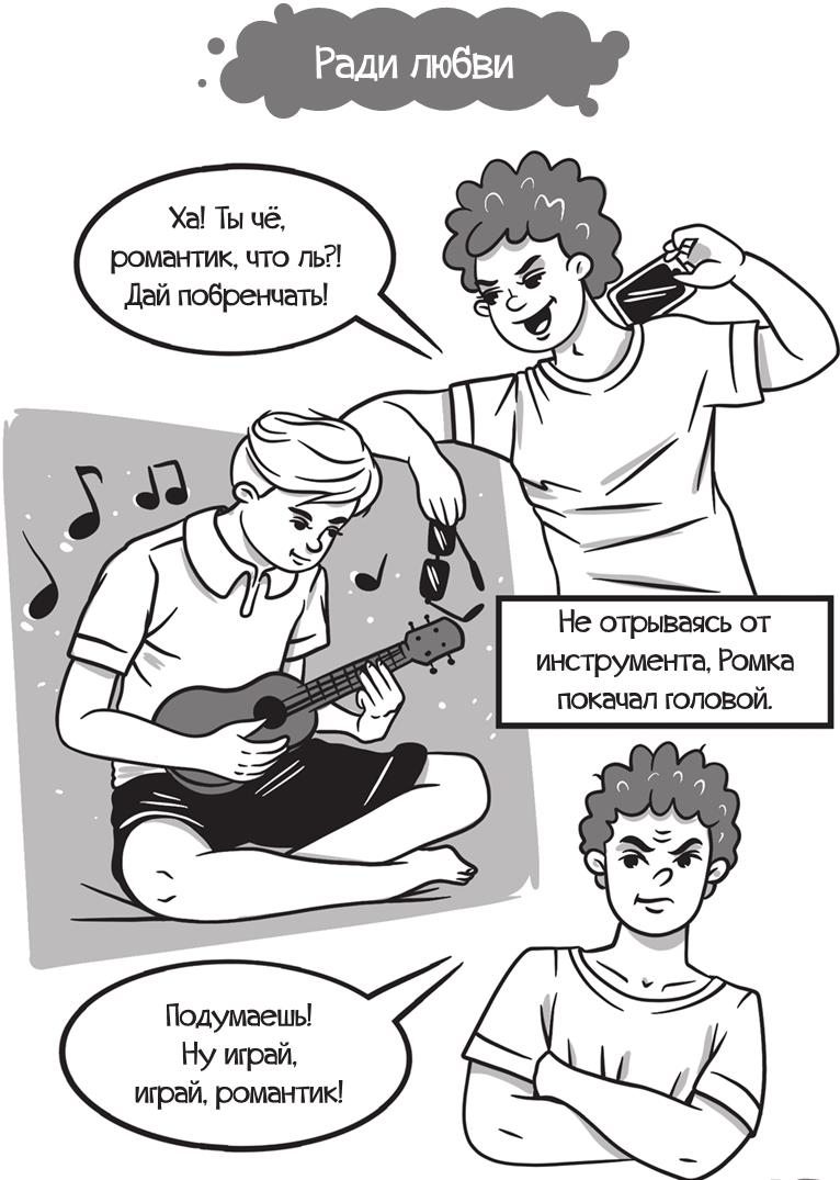 Ромка резко обернулся, взглянул в его ухмыляющееся лицо и понял, что они никогда с ним не подружатся. После ужина Ромка пришёл в свою комнату. Сашка с Пашкой играли в шахматы. Влас полулёжа пялился в телефон. Разговаривать с ним Ромка не собирался. Сел на свою кровать возле окна, достал укулеле, взял аккорд…