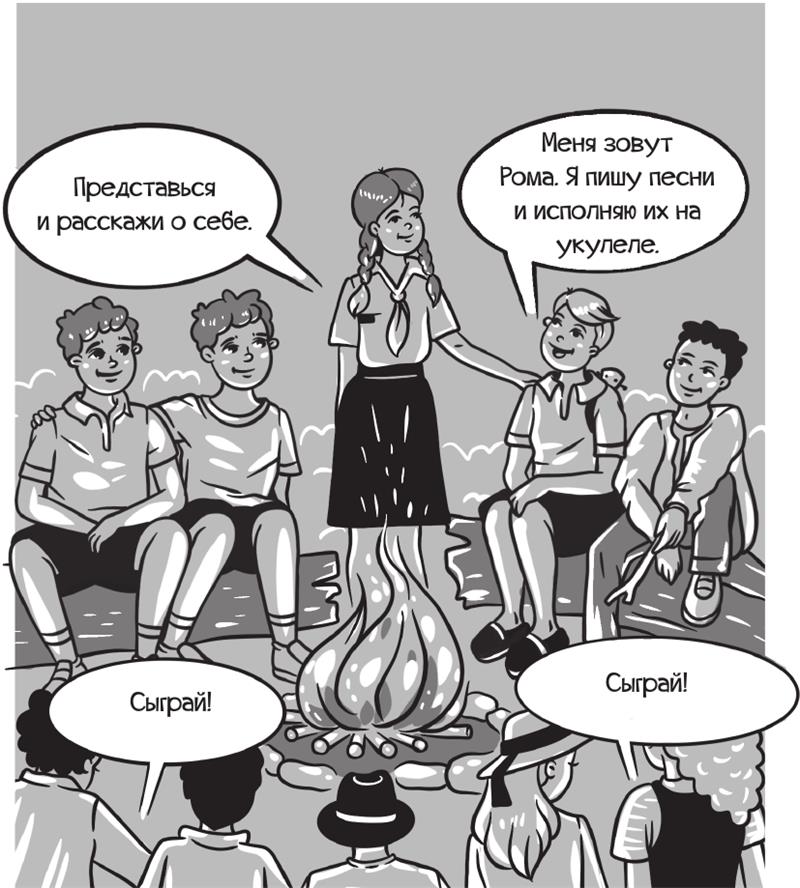 На следующий день вожатые Миша и Галя предложили устроить «костёр», не дожидаясь вечера, чтобы ребята могли рассказать о своих увлечениях, узнать друг друга получше.