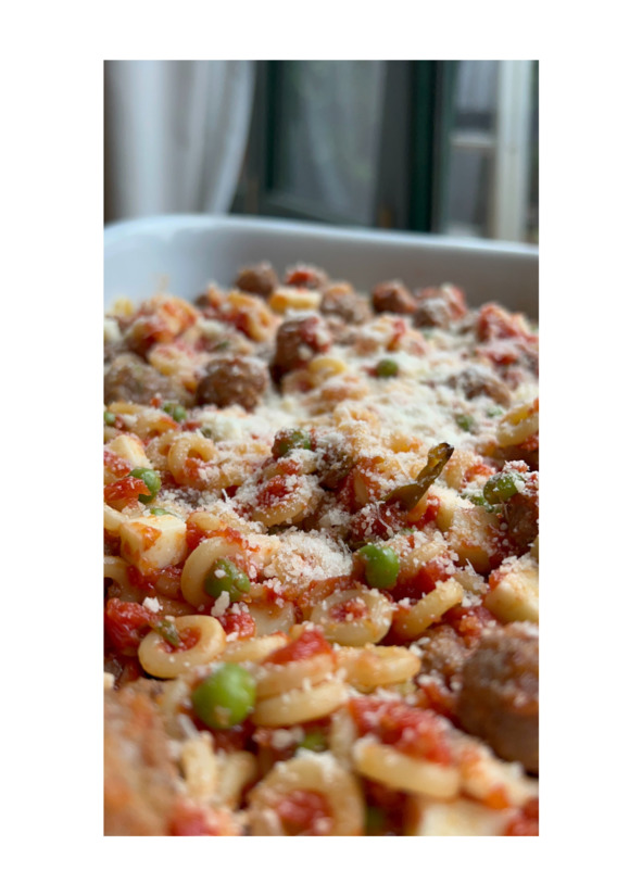 Выложить пасту в глубокую форму или на противень, залить соусом, добавить зеленый горошек, фрикадельки и порезанную кубиками моцареллу. Всё перемешать, посыпать сверху тертым пармезаном.