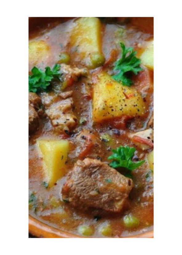 Мясо нарезать кусочками с грецкий орех и добавить к овощам. Когда на мясе образуется корочка, убавить огонь и добавить белое вино. Когда вино впитается, добавить 2 стакана воды, соль и перец. Тушить под крышкой на небольшом огне 40 минут, периодически помешивая. Добавить зеленый горошек и тушить еще минут 20.