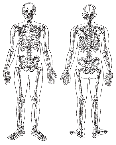Скелет человека (рис. 1) состоит из позвоночника и костей, образующих грудную клетку (кости туловища), черепа (кости головы), костей верхних и нижних конечностей. Позвоночник и кости нижних конечностей в большей мере служат в качестве опоры. Кости конечностей двигаются по принципу рычагов. Череп и позвоночный канал, кости грудной клетки и таза образуют закрытые вместилища для защиты внутренних органов.