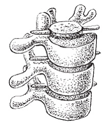 Позвоночный столб (рис. 2) состоит из 33—34 отдельных позвонков. 6 – 9 сросшихся последних позвонков образуют крестец и копчик. Различают шейный (7 позвонков), грудной (12), поясничный (5) и копчиковый (4 – 5) отделы позвоночника. Позвонки соединены между собой межпозвоночными хрящами (дисками) и связками.