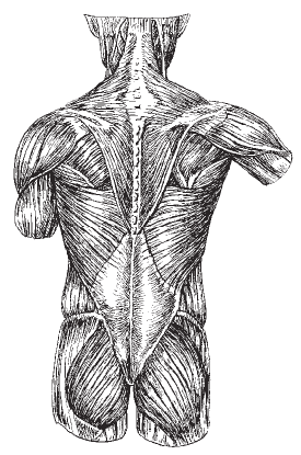 Мышцы туловища представлены мышцами спины, груди и живота. Мышцы спины (рис. 3) делятся на поверхностные и глубокие. К поверхностным относятся трапециевидная и широкая мышца спины; мышцы, поднимающие лопатку; большая и малая ромбовидные мышцы; верхняя и нижняя задние зубчатые мышцы. Мышцы спины поднимают, приближают, приводят лопатку, разгибают шею, тянут плечо и руку назад и внутрь, участвуют в процессе дыхания. Глубокие мышцы спины выпрямляют позвоночник.