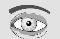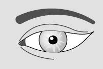 Радужка слегка прикрыта верхним веком и касается нижним краем нижнего века. Белочная оболочка видна по бокам от радужки.