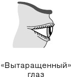 Тип глаза. «Вытаращенный»: выпуклый белок с кровавыми прожилками и желтоватым оттенком, ресницы короткие, брови топорщатся и расположены высоко.