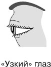 Тип глаза. «Узкий»: глаз находится в узкой глазной щели, без блеска, зрачок со слабой реакцией на свет. Брови в виде правильной дуги, ресницы длинные и редкие.