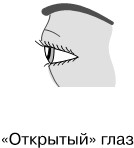 Тип глаза. «Открытый»: глаз широко открыт, взгляд направлен в упор на слушателя. Брови сильно изогнуты и опускаются к виску. Ресницы загнуты круто кверху.