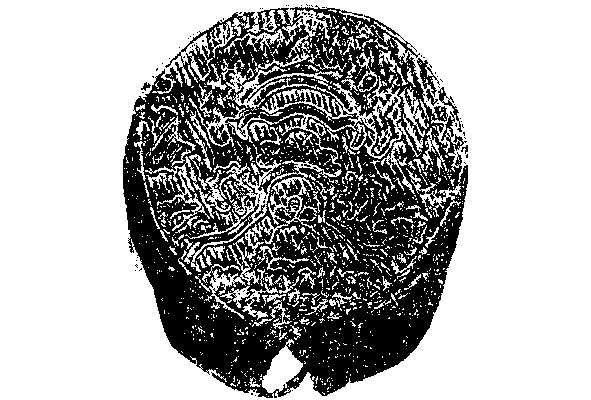 Эти повойники отличает от головных уборов «молодух» обилие серебряного, а не золотого шитья (золото здесь опущено в фон). Даже при беглом взгляде на такой повойник «нашлепку» отчетливо видна бородатая, круглая, оскалившая зубы в недоброй улыбке личина или, говоря по—простому, «рожа» (илл. 5, 6). Но образ этот удивительно полисемантичен, и если внимательно всмотреться в рисунок серебряной вышивки, то перед нами предстанет губастая, носатая и рогатая голова быка. Невольно вспоминаются строки из «Вакханок» Еврипида, слова прозревшего Пенфея, обращенные к Дионису:
