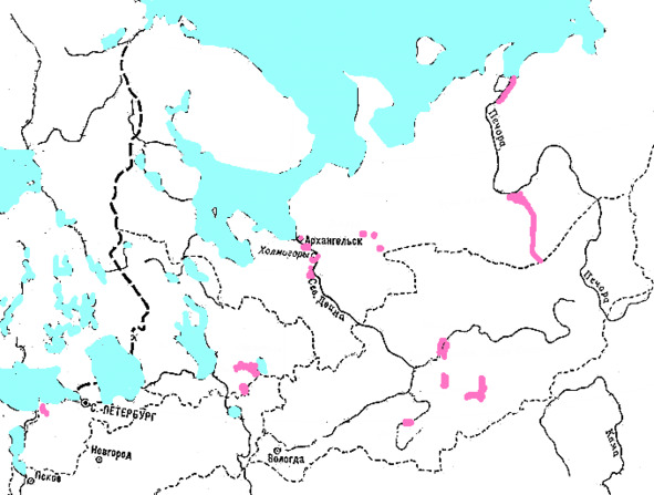 По спискам населенных мест Архангельской губернии 1861г. (сведения приходских списков) чудь жила вместе с русскими в Архангельском, Холмогорском и Пинежском уездах.