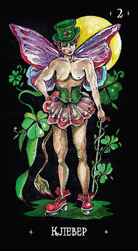 На карте изображен мужчина. Он одет в юбку, на ногах ботинки без шнурков, то есть не завязанные. Почему так? Клевер – это счастье и удовольствие, которые мы получаем от самых обыденных вещей. Это не то, что мы придумали, желаем, а то, что имеем. Человек радуется тому, что у него есть. Вот есть у него хлеб – этому он и рад; светит сегодня солнышко – замечательно; есть крыша над головой – хорошо. За плечами мужской фигуры изображено солнце, оно греет. Надо радоваться тому, что у тебя есть. И пусть ботинки у этого персонажа без шнурков, но самое главное, что он обут!