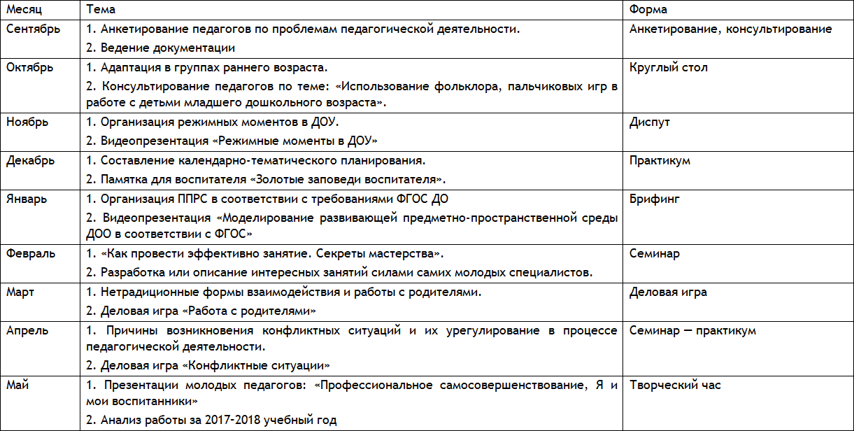 Обеспечение постепенного вовлечения молодых педагогов во все сферы профессиональной деятельности; а также формирование и воспитание у молодых педагогов потребности в непрерывном самообразовании.