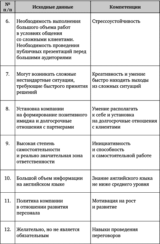 В табл. 4 приведен профиль одной из вакансий, характерных для медицинского бизнеса (продажи и продвижение медицинского оборудования и расходных материалов).