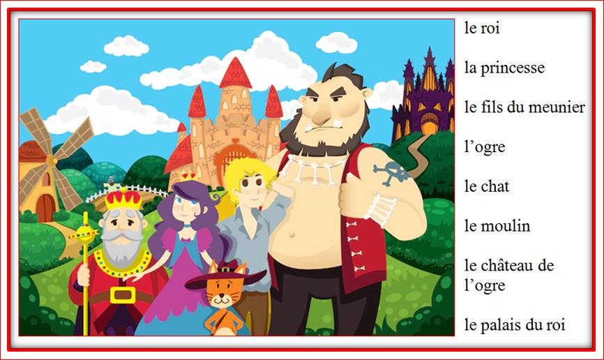 Regardez cette image et nommez tous les personnages du conte ! Quels mots désignent des constructions ? Apprenez par coeur les mots nouveaux !