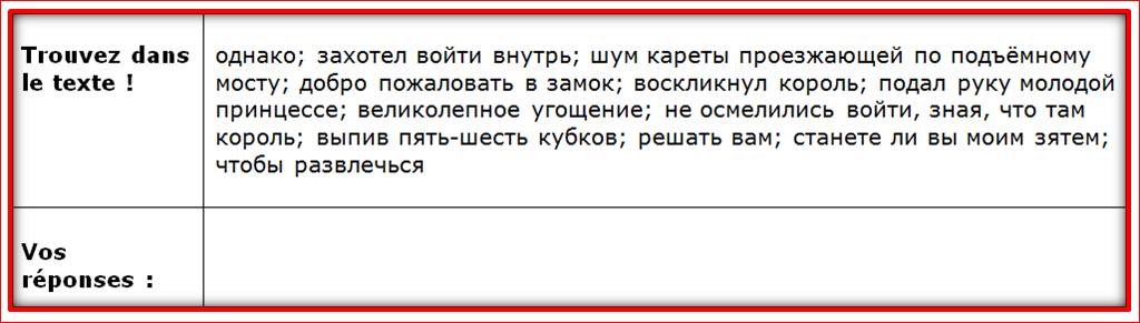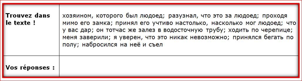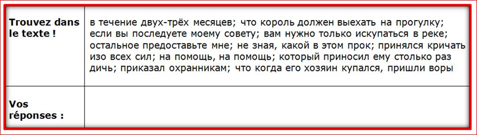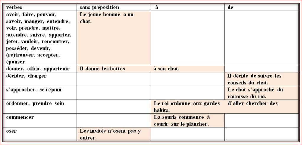 1. Le chat entend __ le discours de son maître. 2. Il dit de lui faire faire __ (заказать) une belle paire de bottes. 3. On le fait __ monter (проводить) à l’appartement de sa Majesté. 4. C’est le nom qu’il a décidé __ donner à son maître. 5. Le Chat botté commence __ porter du gibier au roi. 6. Le roi ordonne __ ses gardes __ aller vite au secours de M. Le marquis de Carabas. 7. Le chat voit __ les paysans qui fauchent le pré. 8. Le Chat botté s’approche __ château de l’ogre.