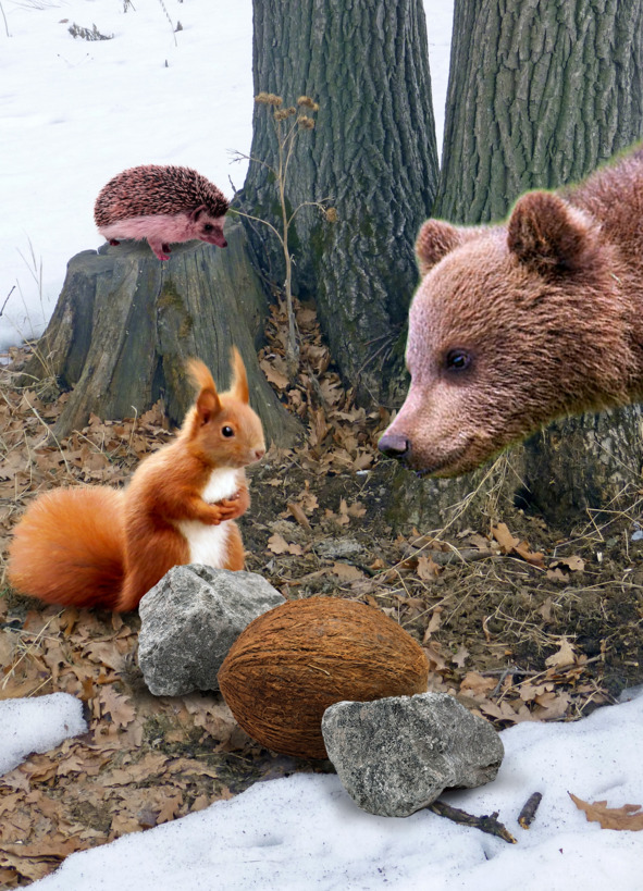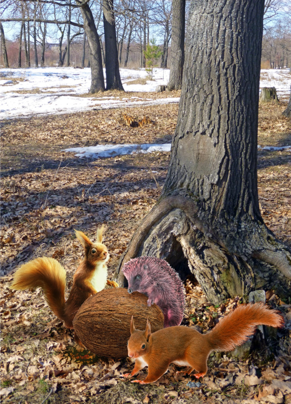 Ёжик спокойно сидел у дуба и играл огромным кокосовым орехом, перекатывая его из стороны в сторону.