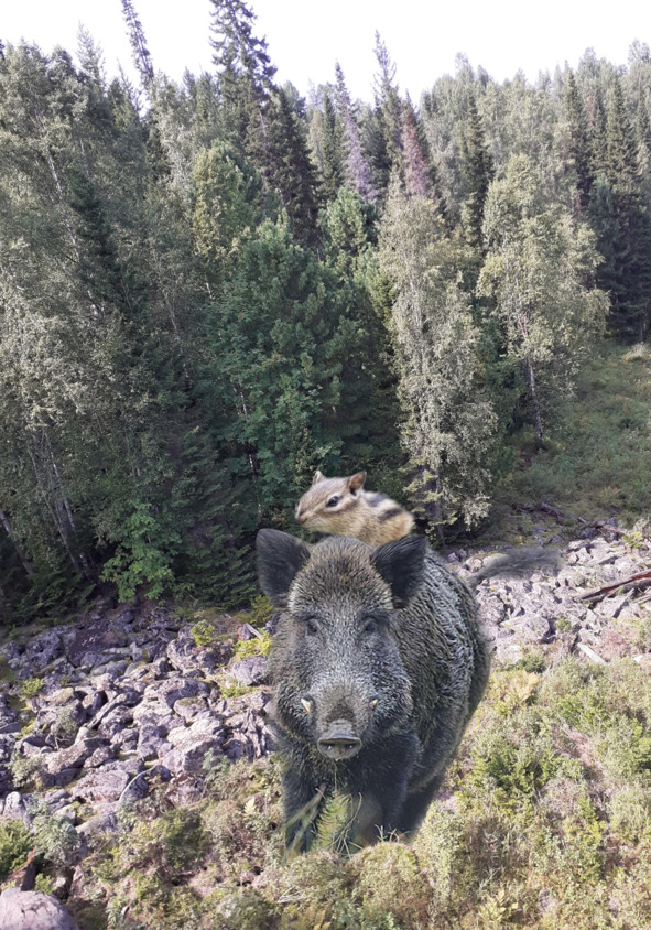 По курумнику, перепрыгивая с камня на камень, летел кабан, а на нём верхом, вцепившись в уши, еле удерживаясь, сидела молоденькая бурундучиха Ру-Ся.