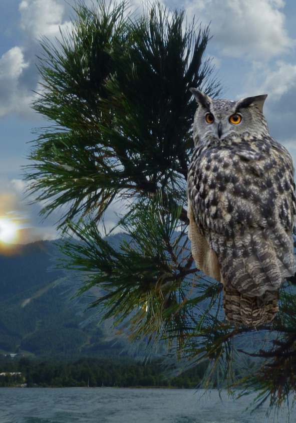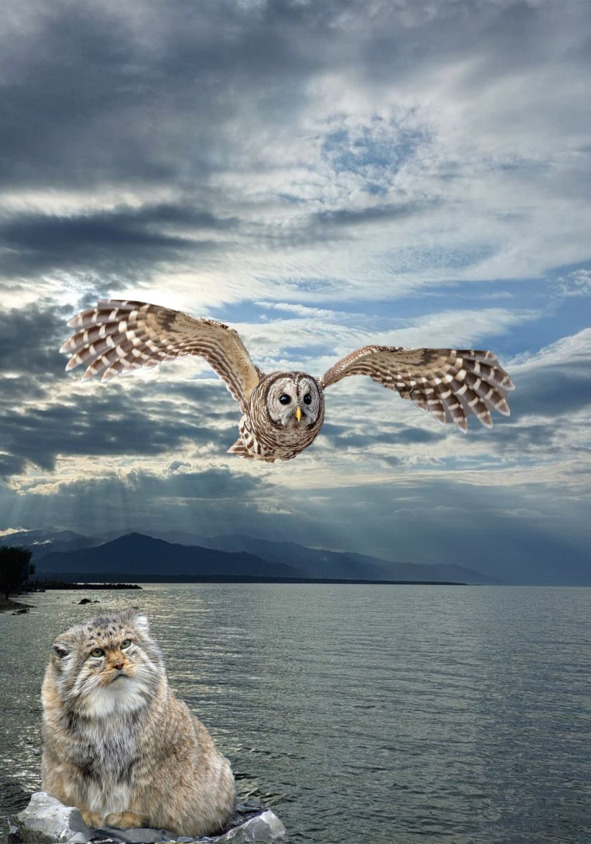 Сова по имени Сови-Ушко и кот Манул вглядывались в гладь озера, а на них из воды смотрел кто-то третий. Глаза незнакомца неспешно закрылись и вновь открылись, приветствуя собеседников.