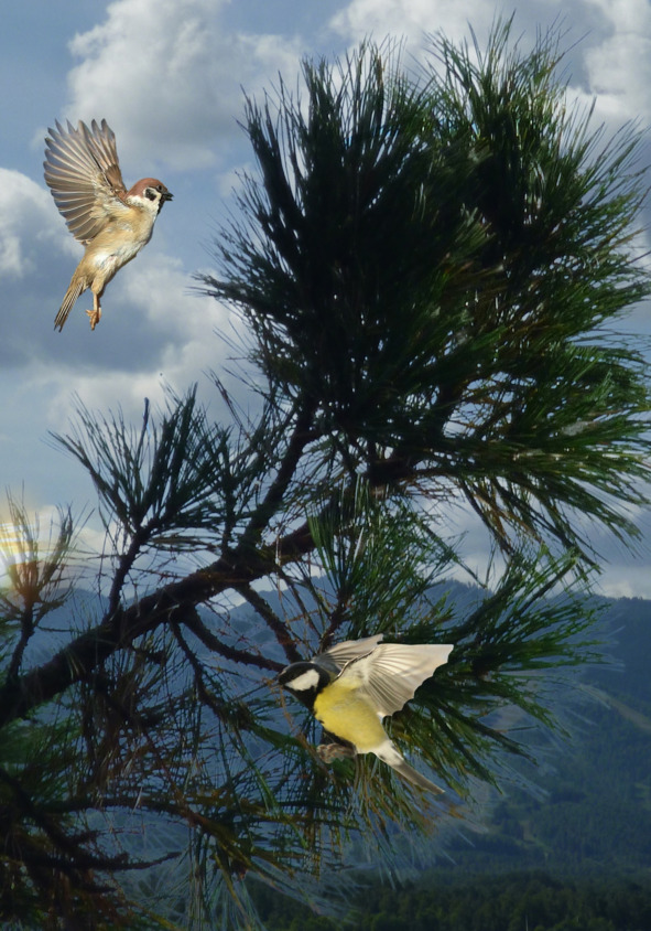 Весь отряд воробьиных активизировался. Оказалось, что в кроне кедра на ночь укрылась целая стайка пичужек разных видов.