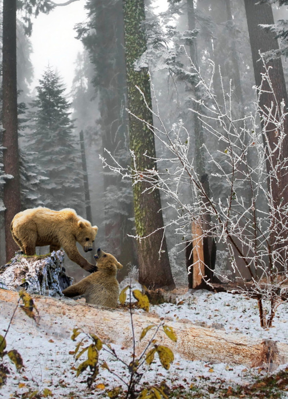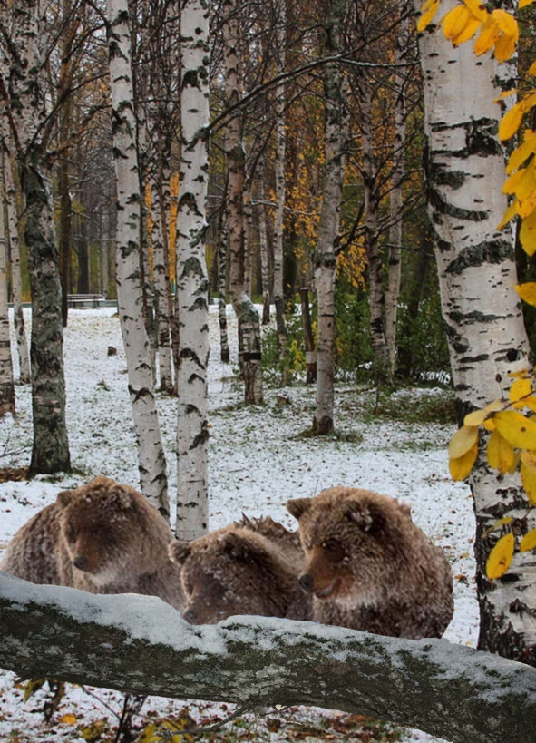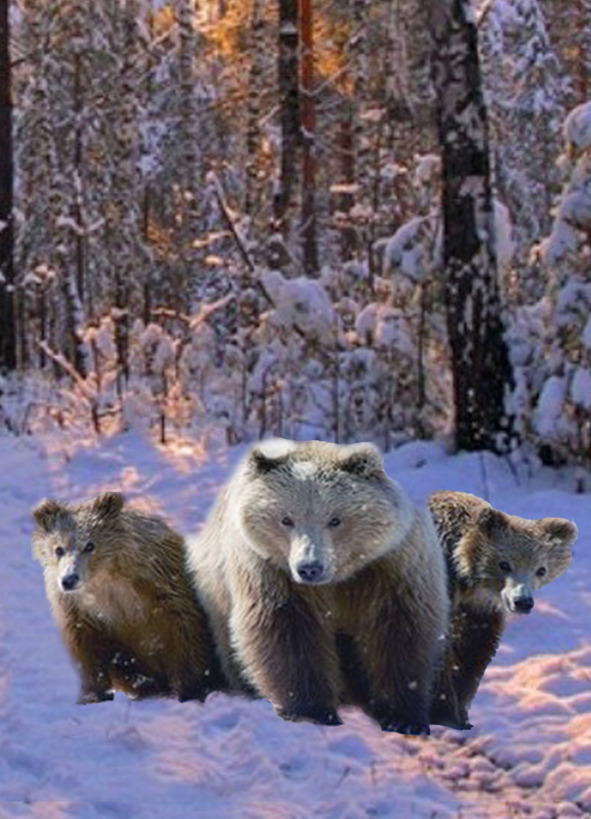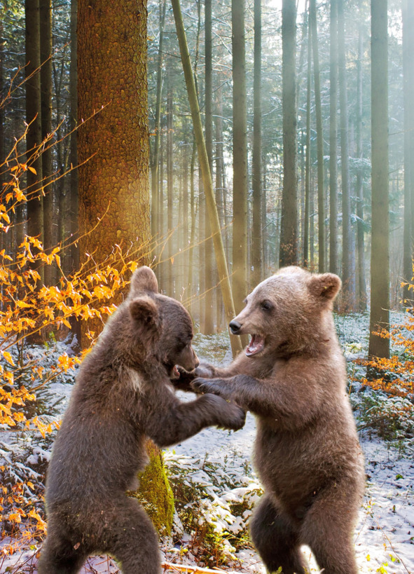 В это время на поляне появились братья—медвежата. Они весело и шумно кувыркались, пытаясь завоевать первенство друг над другом, но заметив старшего брата, не сговариваясь переключили на него своё внимание.