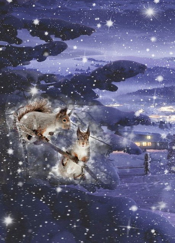 Белки дружно попрыгали с дерева и начали катать в сугробе Лосёнка и Дао. Почувствовав, что они уже отошли от неожиданности и начали неравное сопротивление, бельчата вскочили на нависшие ветки.