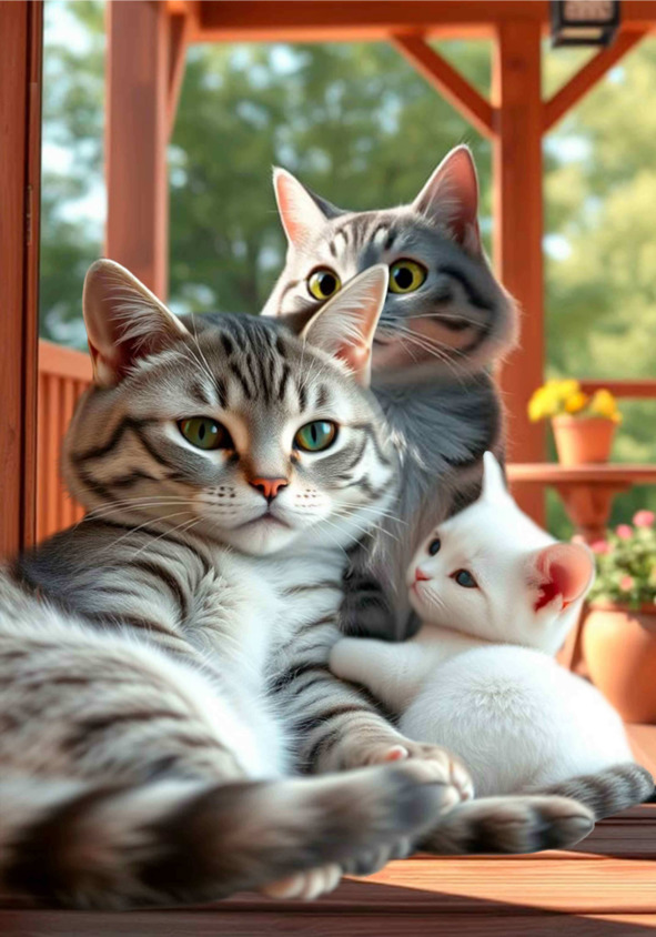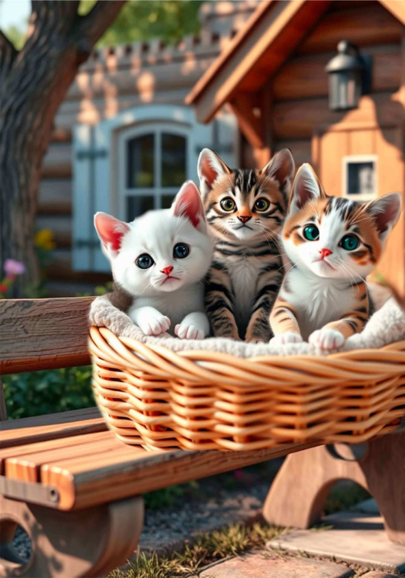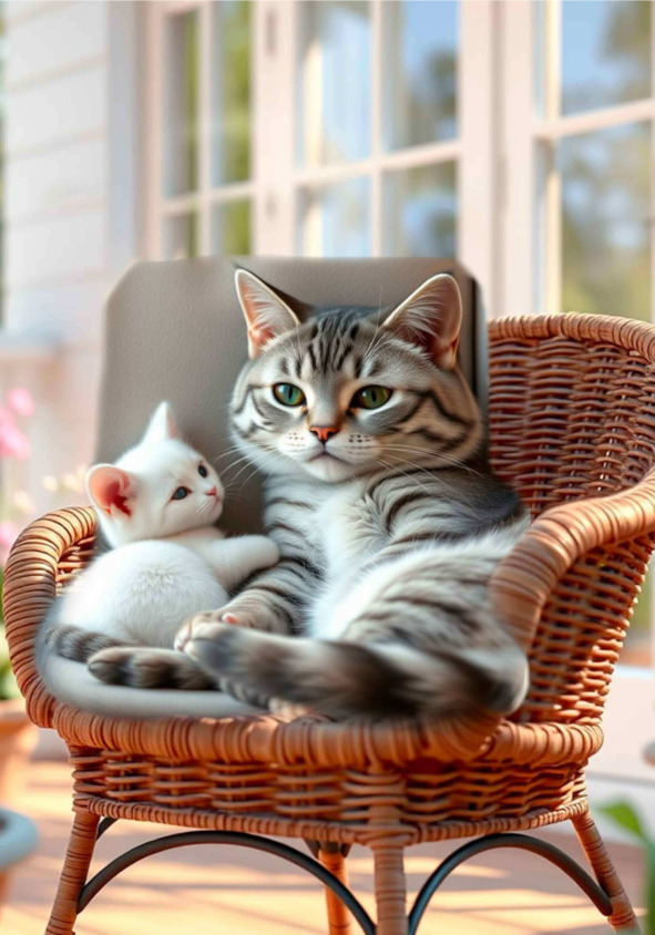 Кошка-мать уютно устроилась в садовом кресле. Ласково мурлыкая, она вылизывала своих котяток.