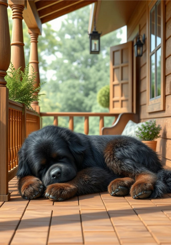 У входа на веранду спал огромный пёс с красивой гривой, как у льва. Котята изредка посматривали в его сторону, но пёс мирно спал.