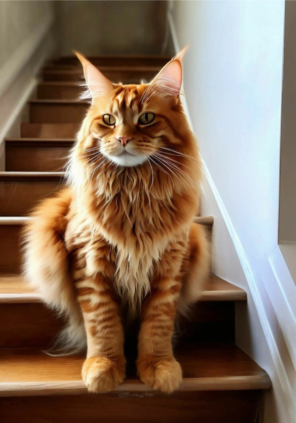 По лестнице со второго этажа спустилась кошка Моня, та, что сожительница и уселась на ступеньках. Папу встречать вышла. Она конечно крутой породы, но характерец у неё, я вам скажу, не очень, видимо, как у всех мейкунов.