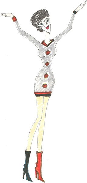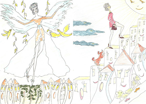 Получилась утонченная, почти воздушная героиня с поднятыми вверх руками, словно крыльями, порхающая в облаках, но при этом она крепко стоит на земле в стильных сапожках на каблуках. У нее приличная грудь, тонкая талия, длинные ноги и платьице выше колен.