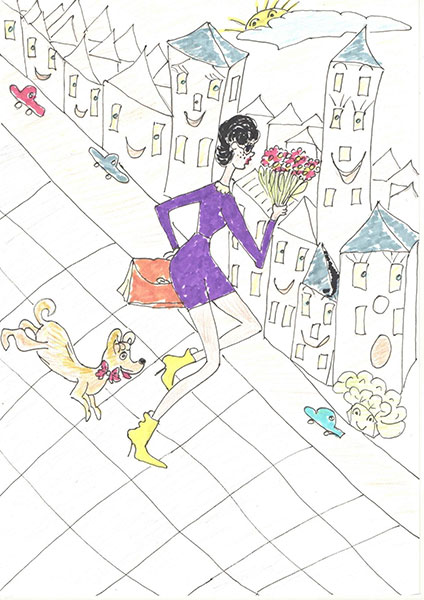 У меня родился динамичный сюжет – на переднем плане яркая, гипертрофированная Мэри Эстейт бежит по улице с букетом в руках, не замечая ничего вокруг, а ей вдогонку улыбаются и удивляются дома, выпучив свои большие окна-глаза.