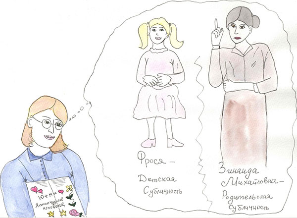 В программе Лизы я узнала о том, что, когда нас некому защитить, мы создаем внутри себя своего защитника – родительскую субличность. Лиза назвала ее Зинаида Михайловна. В то же время в нас всегда живет внутренний ребенок, наша детская часть. У Лизы ее зовут Фрося. Возвращаясь в то время, я увидела, как родилась моя защитница, мой родитель, Зинаида Михайловна. Она взяла руль в свои руки и пошла всех спасать.