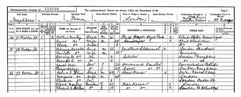 «Бейкер-стрит, близ Портман-сквер. 21-годичная аренда. Плата 210 фунтов. Страховой взнос, включая недвижимый инвентарь, 220 фунтов. Рента без страхового взноса 220 фунтов, недвижимый инвентарь 50 фунтов. Агенты Браун и Ко., Дьюк-стрит, 2, Гроувенор-Сквер, 3.»