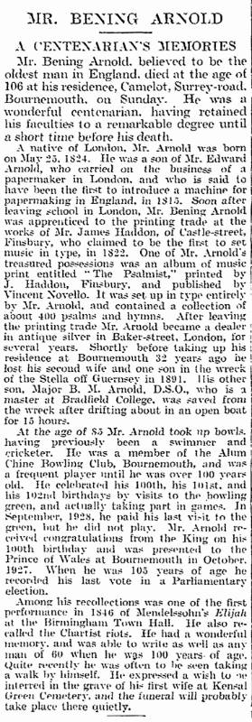 После трагедии Бенинг Арнольд оставил дом на Бейкер-стрит и перебрался в городок Борнемут в графстве Суррей, в дом на Суррей-роуд под названием «Камелот». Здесь в возрасте 85 лет он увлекся игрой в шары, и с увлечением предавался ей, пока ему не исполнилось 104 года. Со столетием его поздравил король, а в октябре 1927 г. он был представлен принцу Уэльскому. Умер мистер Арнольд, когда ему исполнилось 106 лет.