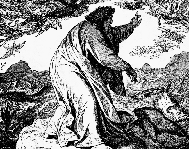 В пятый день творения, по слову Божию, вода произвела душу живую, то есть в ней зародились пресмыкающиеся и рыбы, насекомые и птицы, которые стали летать над землею.