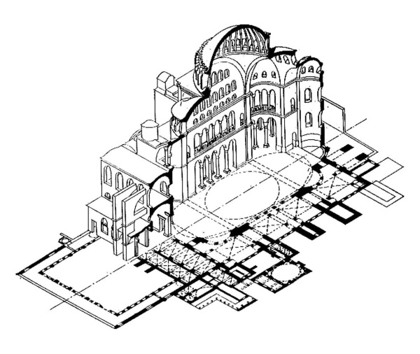Софии при пожаре 532 г. не нужно понимать буквально и что остатки старой Софии следует искать в Софии юстиниановской…»[36]. Исследования XIX века отчасти подтвердили мнение проницательного русского ученого. Со времени обращения мечети в музей, в 1934 году, в Софии Константинопольской был организован ряд специальных исследований, начатых с мозаик. Директор музея Рамазаноглу провел обследование конструктивных частей здания и отчасти кирпичной кладки и фундамента[37]. «В 1935 г. Шнейдер обследовал субструкции атрия и более ранние постройки под ним, а в 1937–1941 гг. Эмерсон и Найс детально обмерили само здание Софии и исследовали некоторые из конструкций…»[38]. По всей видимости, небольшие фрагменты прежней базилики органично вошли в новый храм. Это ставят в вину архитекторам, которые для столь ответственного сооружения решились включить в его конструкции части прежней базилики. Нам представляется, что нельзя современному мировоззрению судить древних. Возможно, они знали об опасности такого соединения, но считали достоинством нового храма, что в нем будут скрыты фрагменты прежнего.