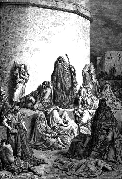 11. Истощились от слез глаза мои, волнуется во мне внутренность моя, изливается на землю печень моя от гибели дщери народа моего, когда дети и грудные младенцы умирают от голода среди городских улиц.