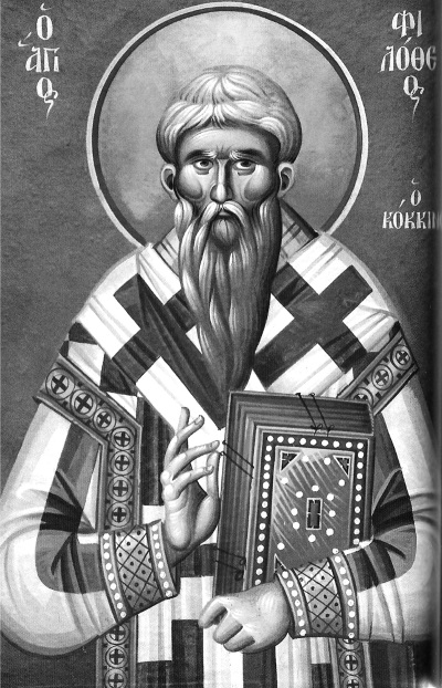 Писателем жития при. Саввы Нового был, несомненно[4], святейший патриарх Константинопольский Филофей Коккин. Родом он был, как видно из предлагаемого его произведения (§ 2), из г. Фессалоники, славившегося в то время «обилием наук и искусств» (§ 2). Получив хорошее по тому времени образование и будучи талантлив от природы, он слыл потом за человека очень умного и образованного. Оставив шум и молву мира (§ 57), он прибыл на Афон, славившийся тогда высокой подвижнической жизнью своих монахов[5], и поступил в число иноков Ватопедской лавры, где вскоре занял первое место в обительском хоре (§ 57). Здесь он неожиданно встретил св. Савву, незадолго перед этим возвратившегося на Афон после долголетних подвигов на Востоке и несшего обязанности по церкви, а также участвовавшего в обительском хоре. Филофей с самого начала был обласкан им, как бы нежным отцом, и вошел с ним в самые близкие и дружеские отношения (§ 57). В течение трехлетнего пребывания св. Саввы в Ватопедской обители Филофей видел назидательный пример его высокой жизни, слышал его дивные наставления и руководился им в духовной жизни. Результатом такого руководства было то, что душа его окрепла, и он стал потом способен сражаться против коварной силы врага впереди других. Скоро, однако, Филофею пришлось разлучиться со своим руководителем и другом. Афонские иноки отправили св. Савву (в 1342 г.) в качестве члена посольства в Константинополь к царице Анне для увещания ее оставить междоусобную войну и примириться с Иоанном Кантакузином. Здесь св. Савва и скончался (в 1349 г.), а Филофей впоследствии сделался митрополитом Ираклийским, а потом, после отказа патриарха Каллиста короновать сына Иоанна Кантакузина, Матфия, возведен был вместо него в 1354 году на кафедру Константинопольского патриарха[6]. После отречения от престола императора Иоанна Кантакузина и падения Матфия патриарх Филофей вынужден был в 1355 году оставить патриаршество. Боясь гнева нового императора Иоанна V Палеолога за приверженность к Кантакузинам, он удалился в монастырь, и патриарший престол опять занял патриарх Каллист. По смерти последнего, в 1362 году, Филофей самим Иоанном V призывается опять к патриаршеству, пользуется его расположением и управляет Константинопольской церковью до 1376 года. В этом году сын императора Иоанна V Андроник при содействии турок вторгся в Константинополь и, заключив отца и брата (Мануила) в тюрьму, вступил на императорский престол. Патриарх Филофей опять вынужден был, и уже навсегда, оставить патриаршество. Кончина его последовала[7]в 1379 году.