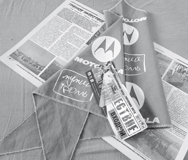 Статью отдал редактору «Техно Бизнес Маркета», он ее поставил в план на готовящийся к печати номер. Подбирая иллюстрации, я наткнулся на фотографию толпы перед входом на фестиваль: в объектив фотографа попала торчащая над головами людей удочка с привязанной к ней на манер флага синей банданой с логотипами группы «Мумий Тролль» и компании Motorola. К слову сказать, эта бандана хранится у меня до сих пор. Бандана, которая пережила «Нашествие».