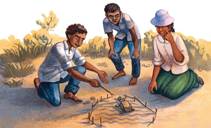 Малеятовит вдогонку. Бежит по тундре, с кочки на кочку прыгает, проваливается в лужи. Быстро бежит, а воры ещё быстрее. Видит Малеятовит – впереди иглу. Добежали воры до иглу и скрылись в ней. Осторожно подобрался Малеятовит, залез на поросшую травой крышу и через отверстие для воздуха заглянул вовнутрь.