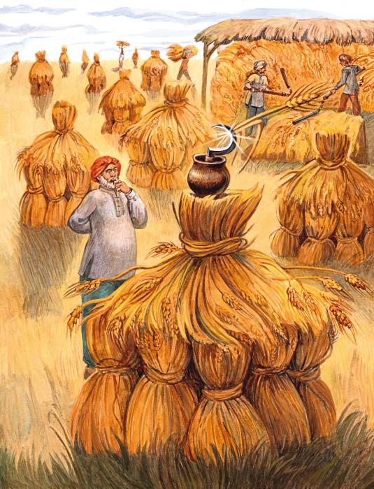 Пошёл, посмотрел староста – пшеница сжата, снопы связаны, под навес уложены. Другие работники их уже молотят.