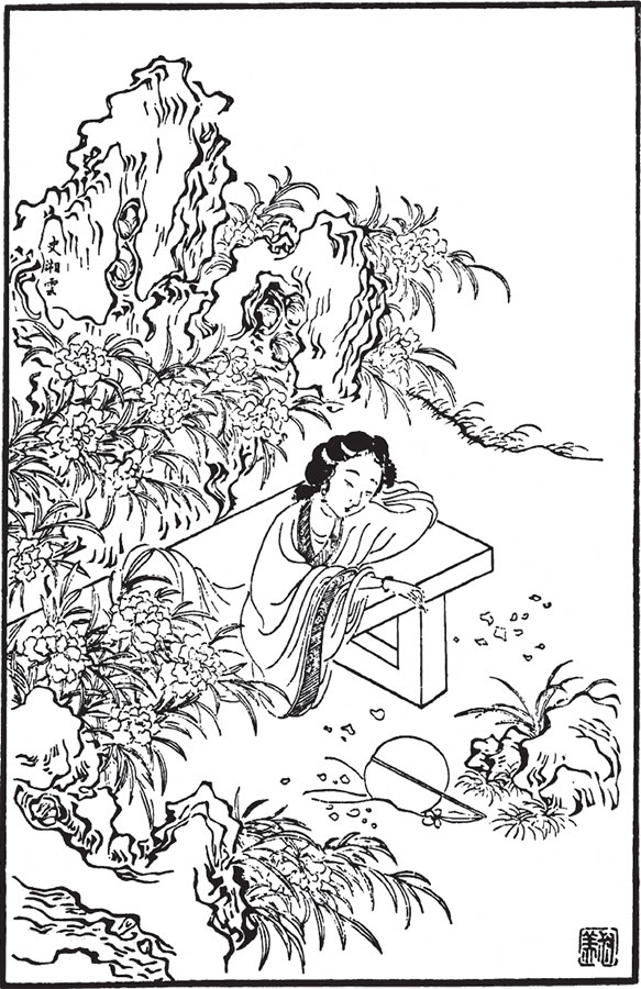 Все гурьбой направились в сад и действительно увидели Сян-юнь, которая лежала на скамейке в укромном местечке и спала сладким сном. Опавшие лепестки цветов гортензии засыпали ей все лицо и одежду. Веер выпал из ее руки и наполовину был покрыт лепестками цветов. Вокруг вились пчелы и бабочки. Под головой у девушки лежало немного лепестков гортензии, завернутых в платочек, которые служили ей подушкой.