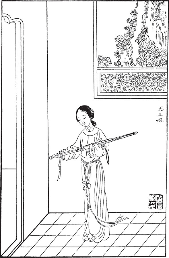 Раскаиваясь в своем поступке, он машинально побрел куда глаза глядят. Неожиданно ему показалось, что он слышит звон женских украшений и к нему подходит Сань-цзе, держа в одной руке «меч утки и селезня», а в другой – свернутую в трубку бумагу.