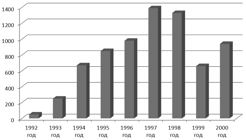 Рис. 2. Динамика развития медиарекламного рынка России в 1992–2000 гг. (млн долл.)[32]