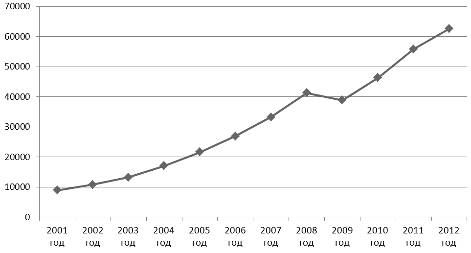 Рис. 3. Динамика роста ВВП России в 2001–2012 гг. (млрд руб., в текущих ценах)