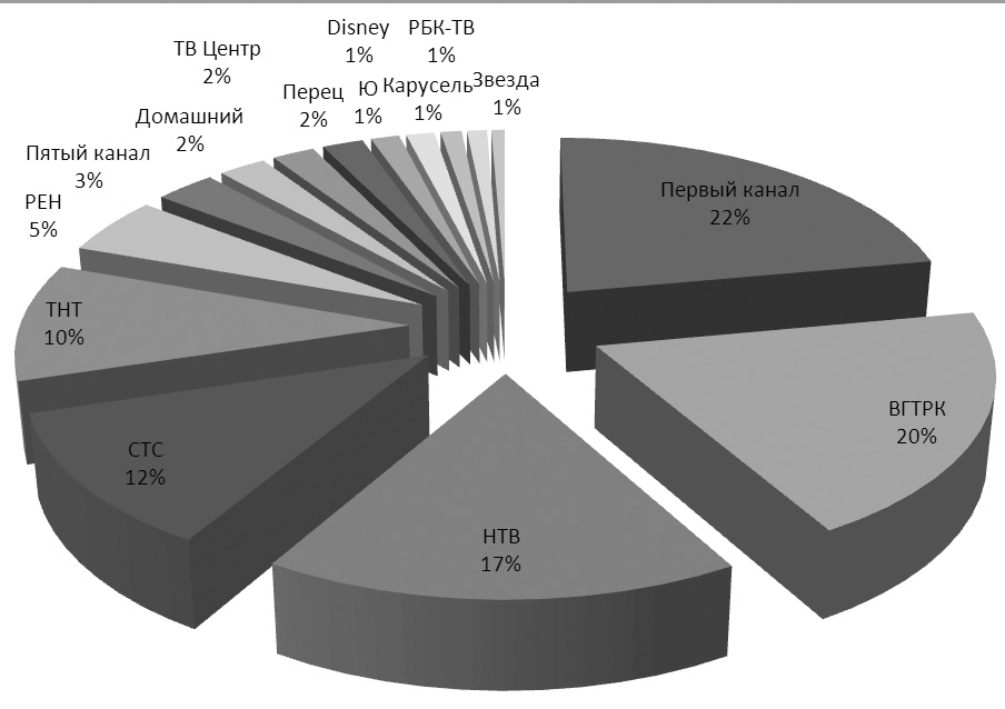 * Допущена вынужденная погрешность, т. к. отдельные данные по выручке телеканалов «Профмедиа ТВ» (ТВ3, MTV, 2Ч2) и «Мир» отсутствуют в базе ГМЦ Росстата.