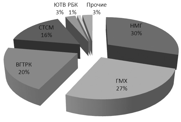 Рис. 14. Выручка медиахолдингов в сегменте федеральных телевещателей в 2012 г. по РСБУ (млн руб.)[95]