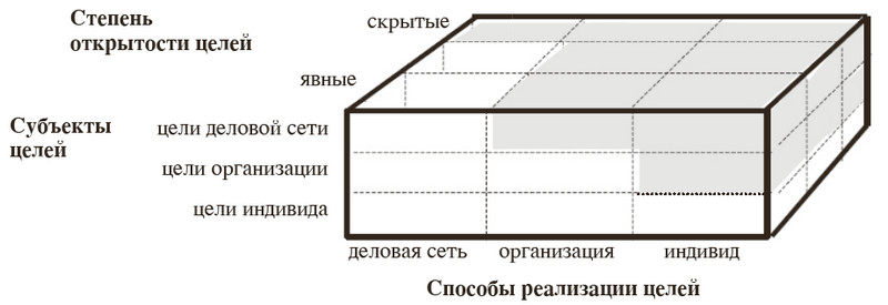 Управление деловыми сетями, по мнению К. Хаксхема, имеет свою специфику (Huxham, 2003). Во-первых, их участники могут быть заинтересованы в совместных действиях, но при этом рассматривать их как средство достижения совершенно разных целей. К тому же каждая сторона такого сообщества является носителем целей разного уровня: это индивидуальные цели участников, цели представляемых ими организаций и групп и, наконец, цели партнерской сети (Eden, Huxham, 2001). Причем в сетях нет возможности четко обозначить все цели совместной деятельности, значительная их часть остается скрытой (рисунок 1.1).