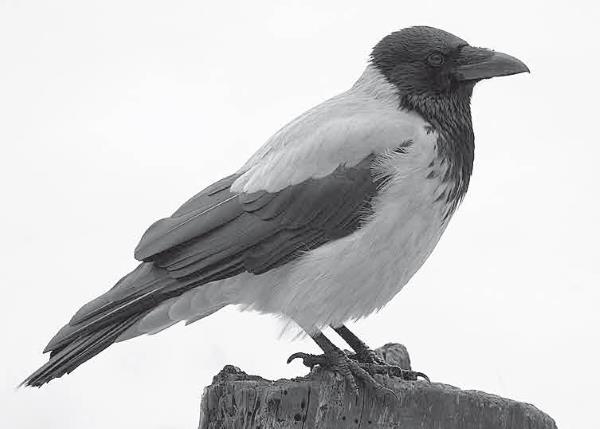 Это крупная птица не выделяется яркостью окраски. Голова, клюв, горло, крылья, хвост и лапы у вороны черные, а все остальное серое.