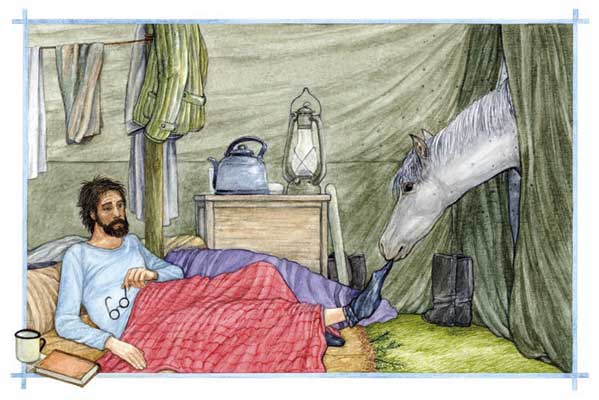 Геолог велел ему уходить, но конь продолжал ловить губами пальцы его ног, как будто хотел стащить своего друга с постели. Пришлось человеку встать, чтобы его выгнать. Конь послушно вышел, но через какое-то время снова просунул голову в палатку и тихо, но настойчиво заржал. При этом он делал такое движение головой, словно просил товарища следовать за собой. Геологу ничего не оставалось делать, как снова встать и последовать за своим провожатым.